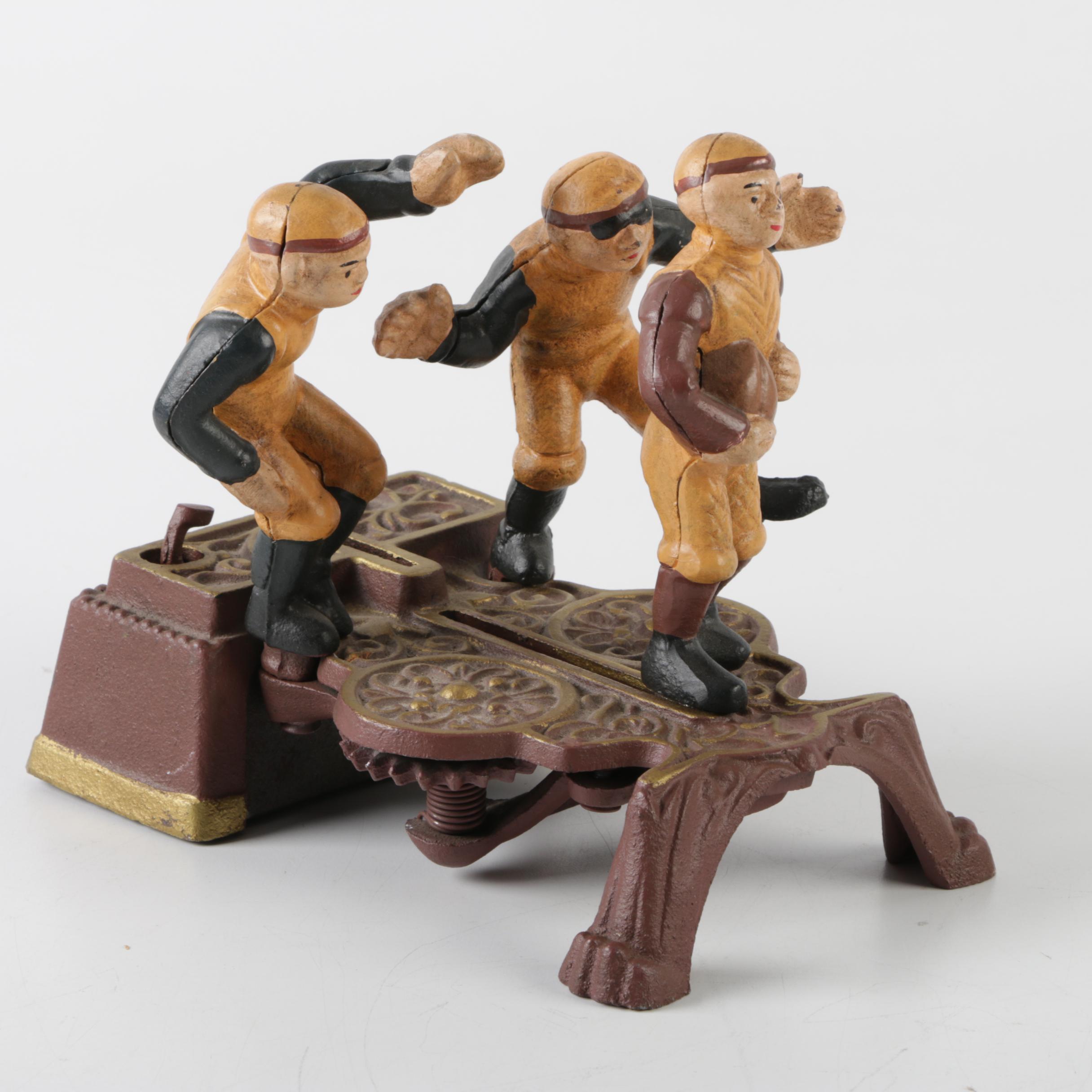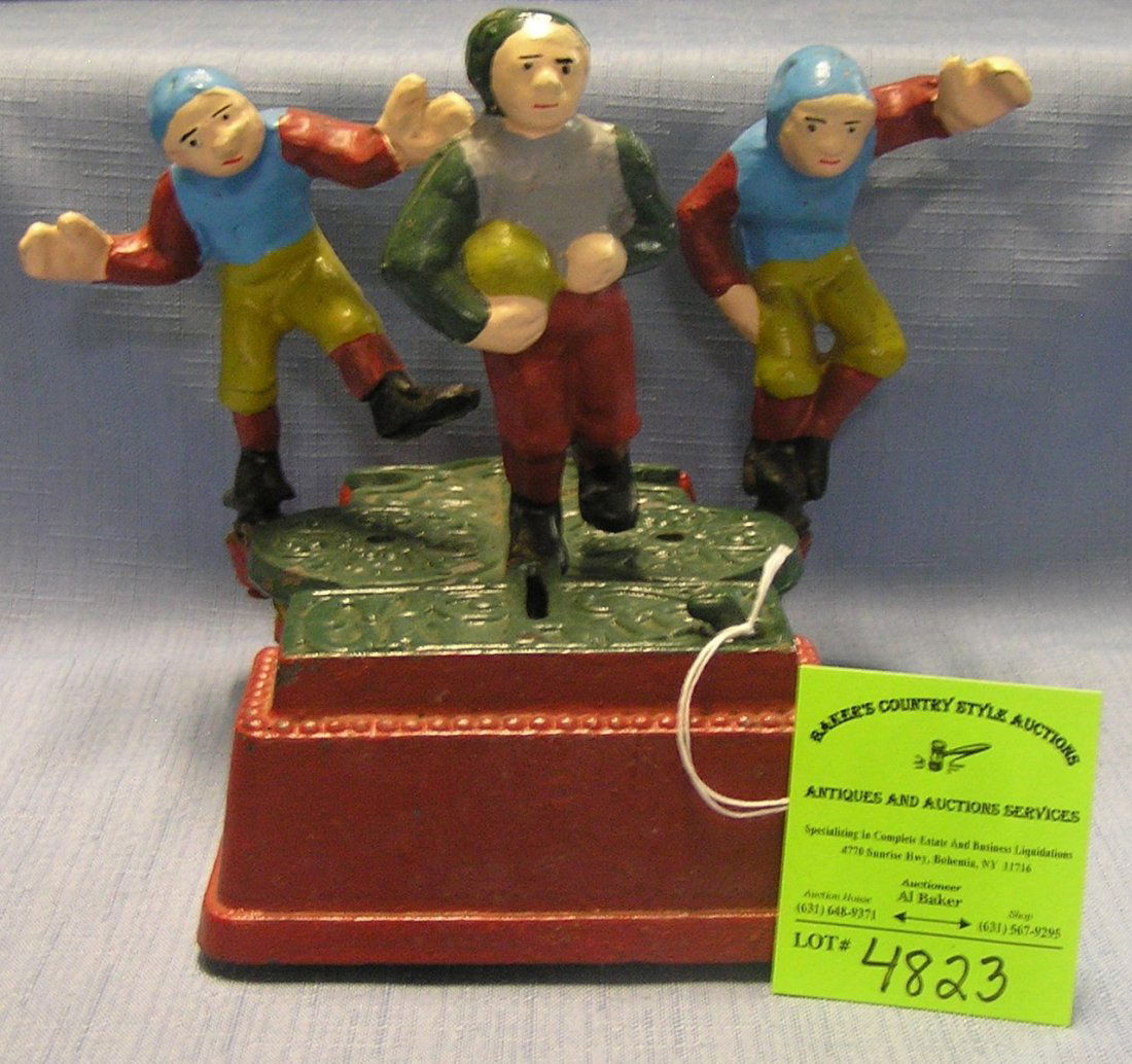 Cast Iron Mechanical Football Players Coin Bank | EBTH from ebth-com-production.imgix.net This is the english football bank mechanical bank manufactured by john harper & company, of willenhall, staffordshire, england. You can check out football bankbuilder her. It keeps a tally of savings balance with every deposit and you hear your fans cheer touchdown product information product dimensions 9.2 x 5.5 x 5.4 inches item weight 1.65 pounds asin b0035m8qss This calamity mechanical bank sold for $33,500.00 in morphy's auction december 2008.calamity banks were made of cast iron by the j. Choose from contactless same day delivery, drive up and more. This is considered by some to be a rare bank. 5 out of 5 stars. This is a brief description of the english fooball mechanical bank and s.